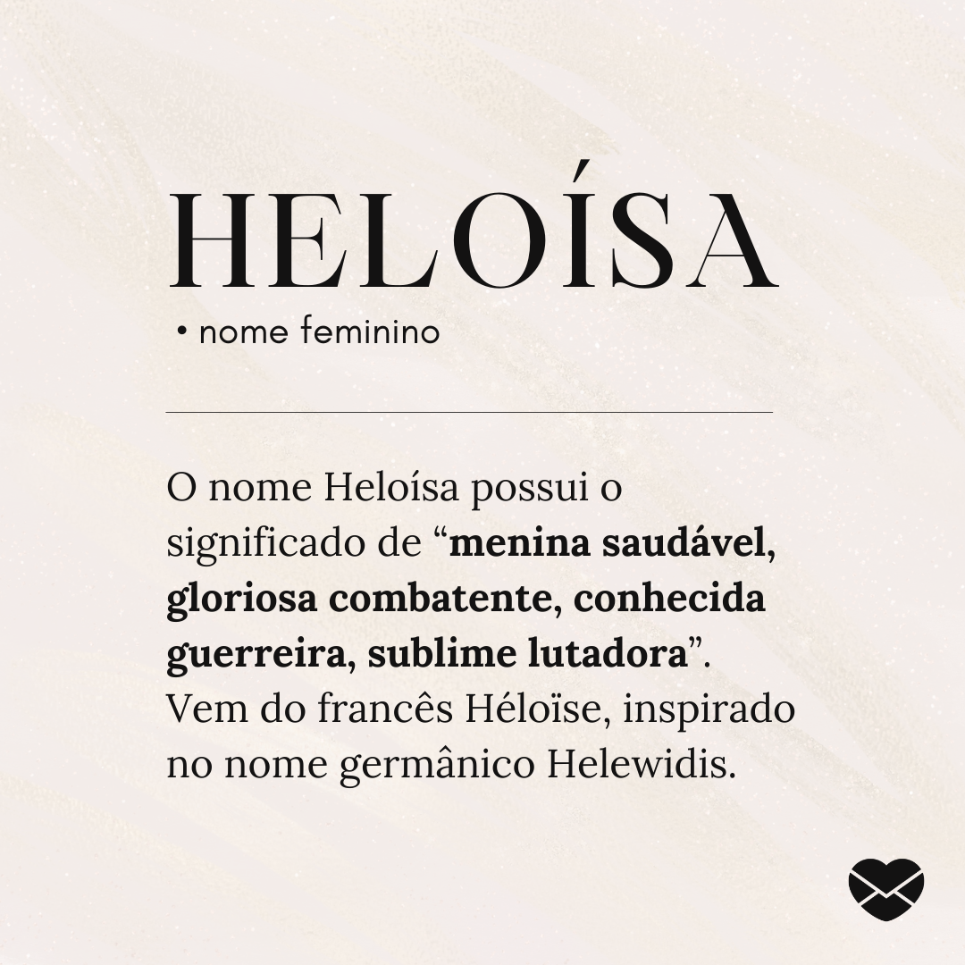Significado do nome Heloísa. Heloísa com origem no francês significa " saudável " e com origem no germânico significa "famosa guerreira". A personalidade de Heloísa simboliza coragem, bravura e determinação. Além disso, o seu significado está ligado a saúde, dessa forma, também simboliza uma menina saudável e cheia de.