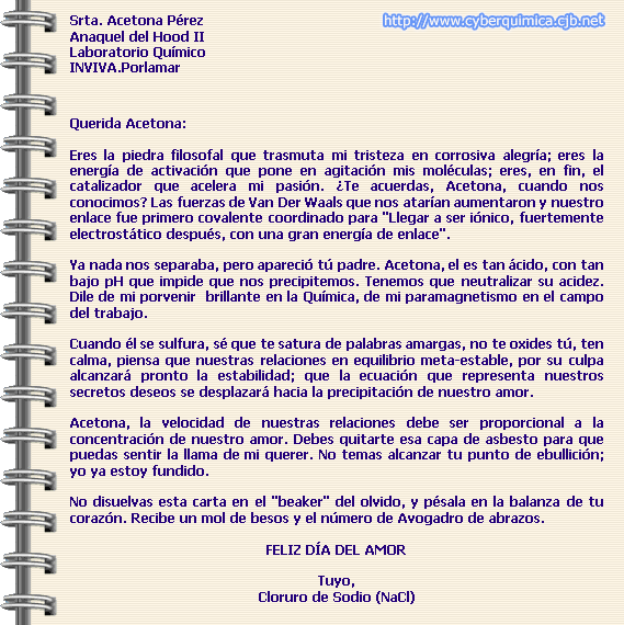 Carta de Amor de um Químico. Berílio Horizonte, zinco de benzeno de 2000. Querida Valência: Não estou sendo precipitado e nem desejo catalisar nenhuma reação irresversível entre nós dois, mas sinto que estrôncio perdidamente apaixonado por você. Sabismuto bem que a amo. De antimônio posso lhe assegurar que não sou nenhum érbio e.