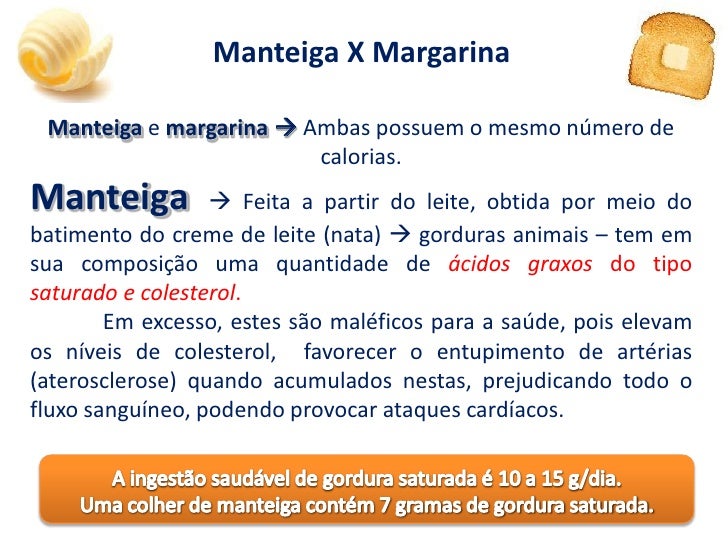 A margarina é feita de óleos vegetais que possuem uma maior quantidade de gorduras insaturadas, as gorduras boas. A Organização Mundial da Saúde recomenda que esse tipo de gordura seja mais consumido do que as gorduras saturadas, presentes em grandes quantidades na manteiga.