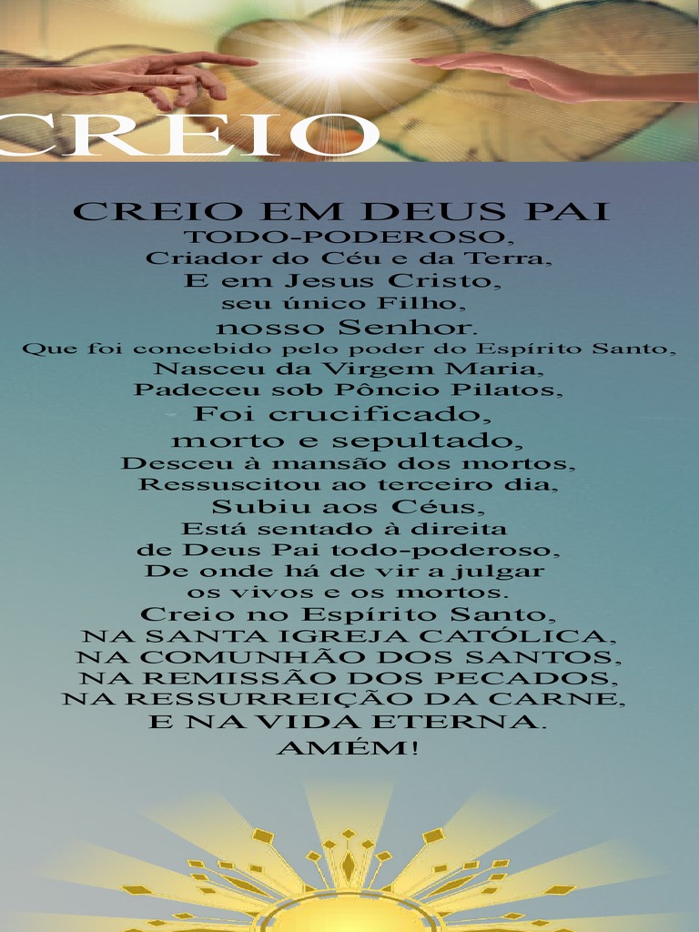 Oração do credo. Creio em Deus Pai Todo-Poderoso, Criador do céu e da terra, creio em Jesus Cristo, seu único filho, Nosso Senhor, que foi concebido pelo poder do Espírito Santo, nasceu da Virgem Maria, padeceu sob Pôncio Pilatos, foi crucificado morto e sepultado, desceu à mansão dos mortos, ressuscitou ao terceiro, dia subiu aos céus.