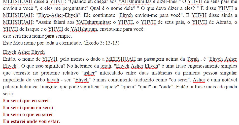 Ocorre que estes termo não são, e não constituem o nome do Eterno, conforme explicou o Rabino Yosef Bechor: "Eu serei o que serei", אֶהְיֶה אֲשֶׁר אֶהְיֶה "Ehyeh asher ehyeh", é a explicação do único nome com quatro letras [hebraicas], escrito por toda a Torá, porque Aquele que é Santo (abençoado seja.