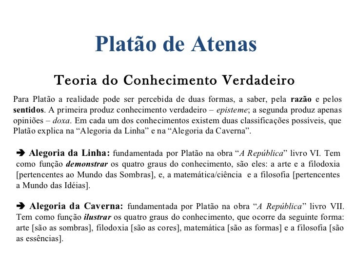 Resumo sobre Platão e a Alegoria da Caverna: Platão acredita que por de trás do nosso mundo, chamado mundo dos sentidos, existe uma realidade abstrata, chamada de mundo das ideias, onde tudo é perfeito e eterno. Nós só podemos chegar a este mundo, onde se encontra o verdadeiro conhecimento, por meio da razão.