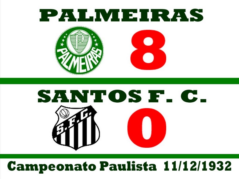Palmeiras x Santos: as maiores goleadas. O marcador mais elástico a favor do Palmeiras aconteceu também em duelo do Campeonato Paulista, quando o então Palestra Itália anotou 8 x 0 sobre o Santos, em 1932, no estádio da Ponte Grande, em São Paulo, com gols de Romeu Pellicciari (duas vezes), Lara, Sandro, Luiz Imparato (também duas vezes.