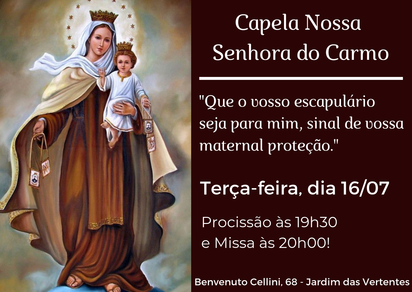 O estreito caminho do Céu, tornaste-o visível, praticando sempre as mais humildes virtudes". Vatican News. Hoje, 16 de julho, celebramos a Festa de Nossa Senhora do Carmo, solenidade na Ordem Carmelita que desde suas origens cultiva e propaga a devoção à Santíssima Virgem Maria. O Monte Carmelo na Palestina, lugar que nos remete aos.