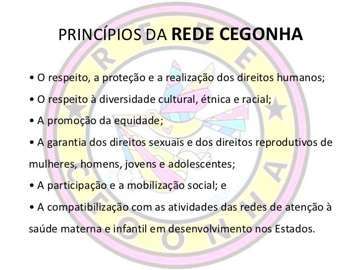 Princípios da Rede Cegonha: I - o respeito, a proteção e a realização dos direitos humanos; II - o respeito à diversidade cultural, étnica e racial; III - a promoção da equidade; IV - o enfoque de gênero; V - a garantia dos direitos sexuais e dos direitos reprodutivos de mulheres, homens, jovens e adolescentes;