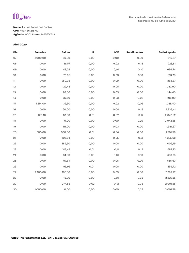 em cada item,determine o valor correspondente à movimentação financeira de uma conta bancaria