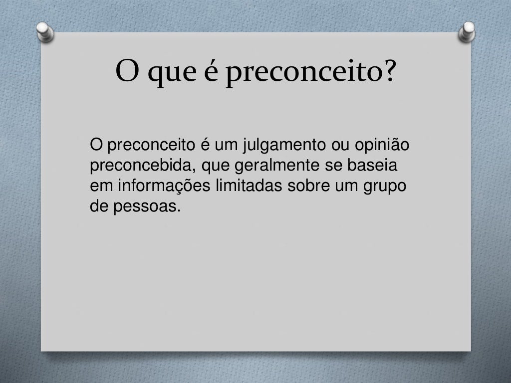 O preconceito racial, também chamado de racismo, é a discriminação contra pessoas tendo como base sua raça ou etnia. Geralmente, o preconceito acontece quando a pessoa ou um grupo é visto de.