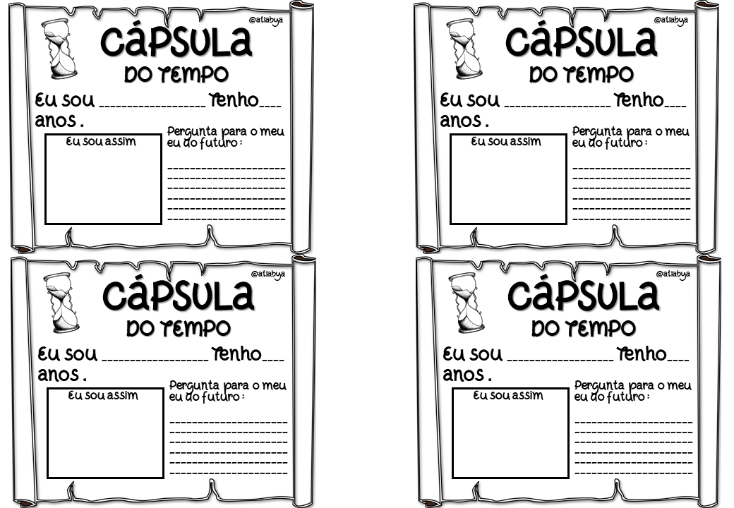 CÁPSULA DO TEMPO (2023 atualizado) fevereiro 18, 2023. Olá professores, mais um ano se passou e uma atividade que eu não poderia deixar de fazer com meus alunos é a Cápsula do Tempo, onde o objetivo é guardar uma lembrança do passado para o futuro, além deles verem se cumpriram suas metas e objetivos e também se mudaram seus gostos.