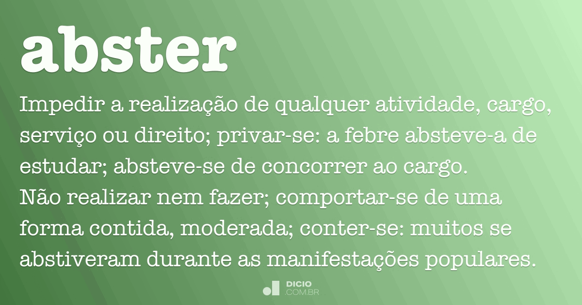 Significado de Abster-se no Dicio, Dicionário Online de Português. O que é abster-se: Significado de Abster Impedir a realização de qualquer atividade, cargo, serviço ou direito; privar-se: a febre absteve-a de estudar; absteve-se de concorrer ao cargo. Não realizar nem fazer; comportar-se de.