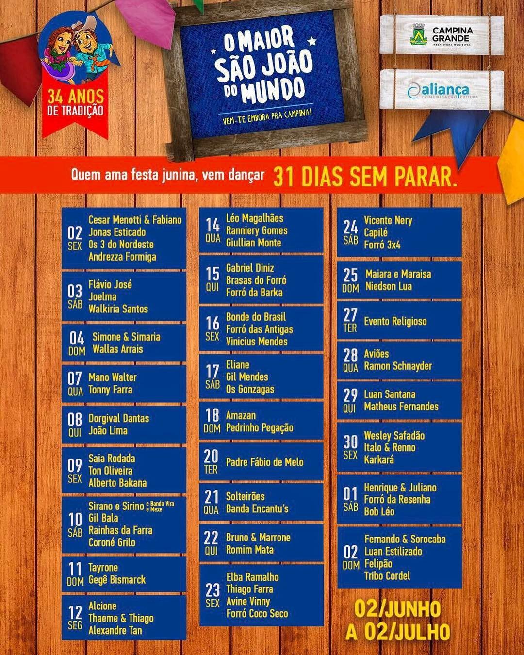 Confira a programação oficial do São João de Campina Grande que acontece de 01 de Junho a 02 de