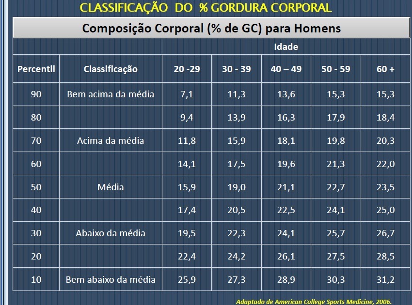tabela percentagem gordura corporal adipômetro Avaliação Morfofuncional