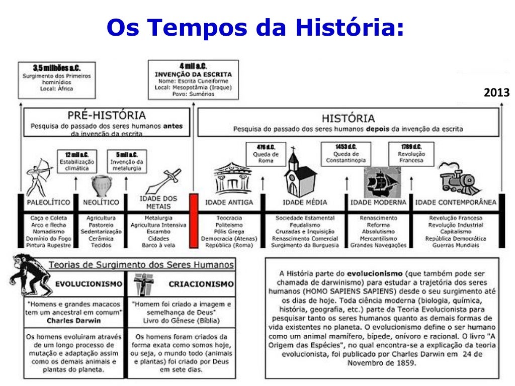 Períodos da História. Há um certo consenso entre os historiadores ocidentais quanto à divisão da História.. Vejamos os cinco períodos da História:. Pré-história: envolve todo o período que antecedeu a invenção da escrita, que ocorreu por volta de 3500 a.C.; Idade Antiga: compreende o desenvolvimento da escrita até a queda do Império Romano do Ocidente, ocorrido em 476.