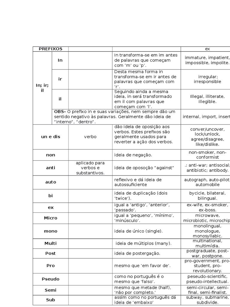 Tabela de Prefixo e Sufixo en Inglês Unidades Semânticas Relacionamentos Sintáticos